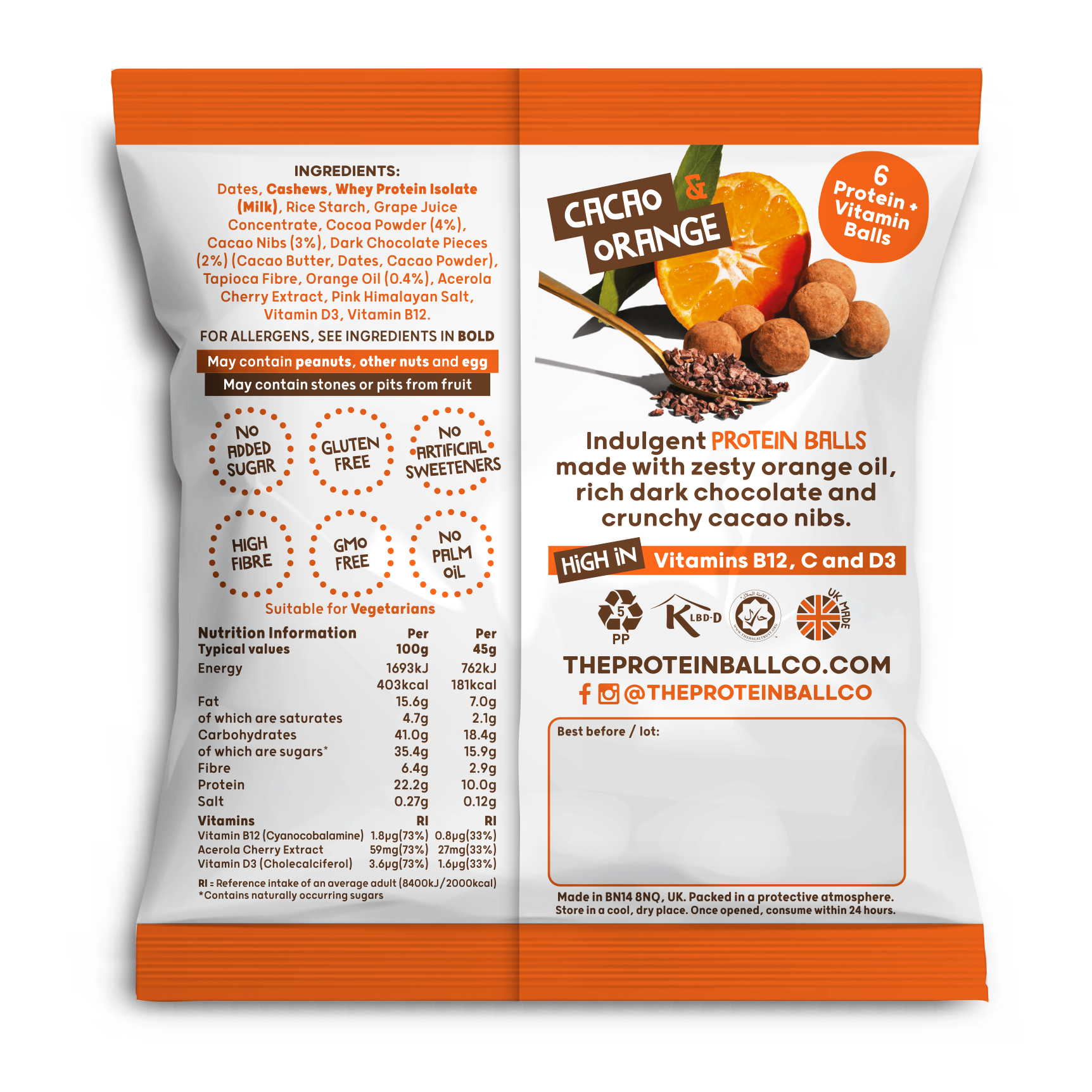 A delicious triple-chocolate sensation! We’ve blended zesty orange oil into each rich, dark chocolatey ball to create the perfect indulgence. They’re packed with crunchy cacao nibs, cocoa butter, creamy whey protein and juicy dates, all richly dusted with cacao powder.