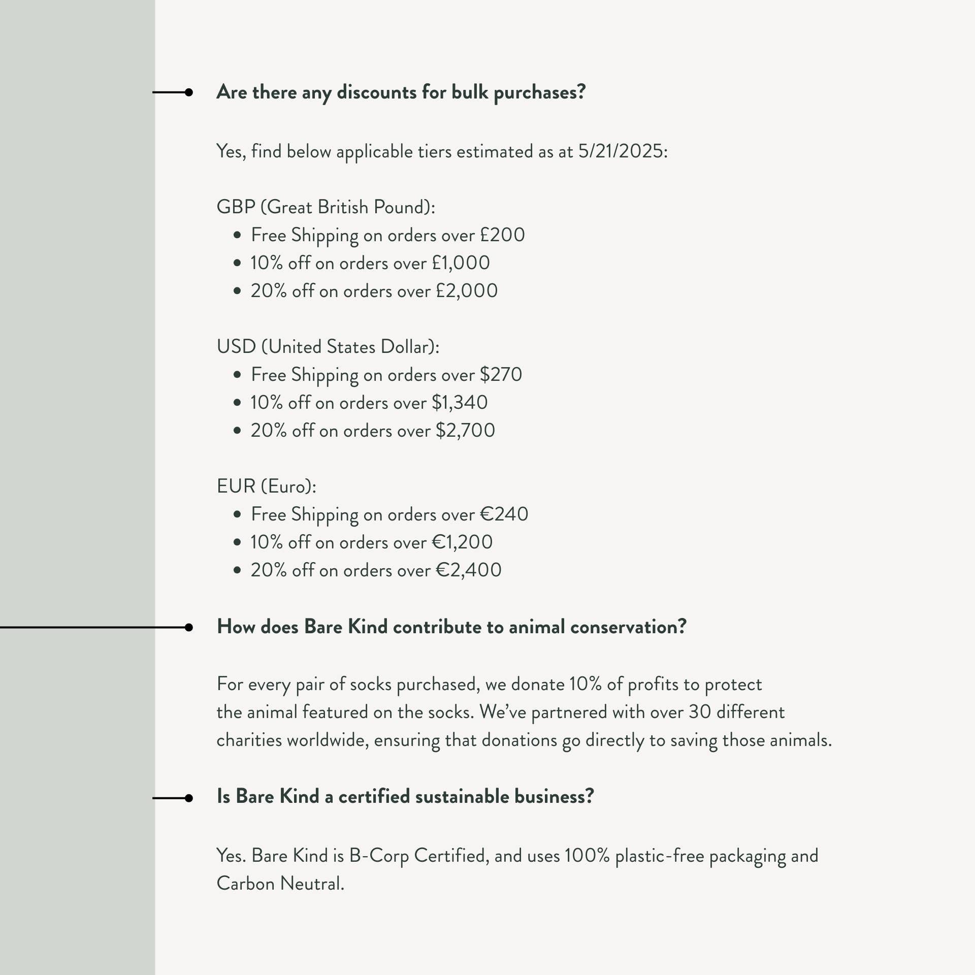 These Socks Save Giraffes. With 10% of profits donated to the Giraffe Conservation Foundation these socks are: * Thermoregulating (cool in summer, warm in winter) * Sweat-proof (moisture-wicking & anti-bacterial) * Softer than cotton * Wash cold for the environment (30 degrees) * OEKO-Tex Certified * SEDEX Audited * 100% Recyclable packaging Bare Kind was founded by Lucy in 2018 to save endangered animals worldwide through partnerships with Charities. These socks are part of the Outback Collection, inspired by the incredible bushlands of the world. These gender neutral socks are loved by all.