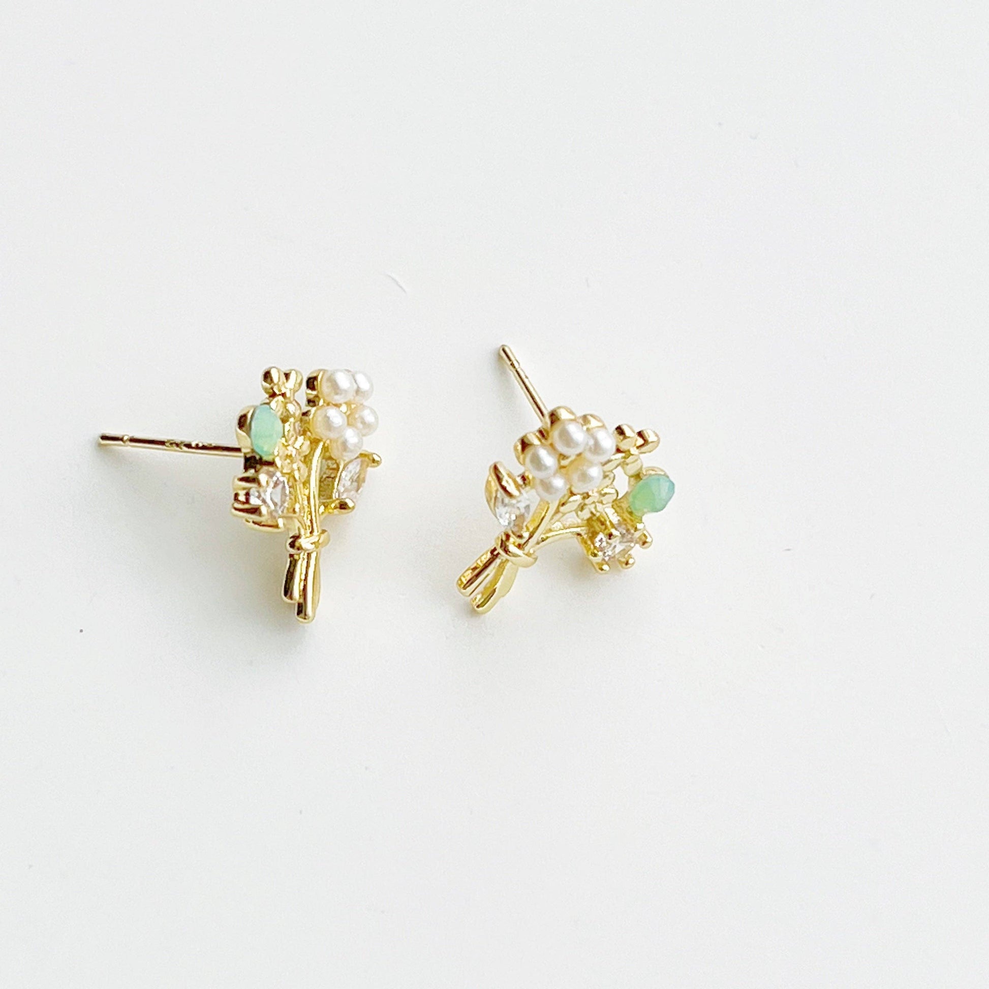 Ninaouity - Gold Flower Banquet with Pearl and Green Crystal Earrings