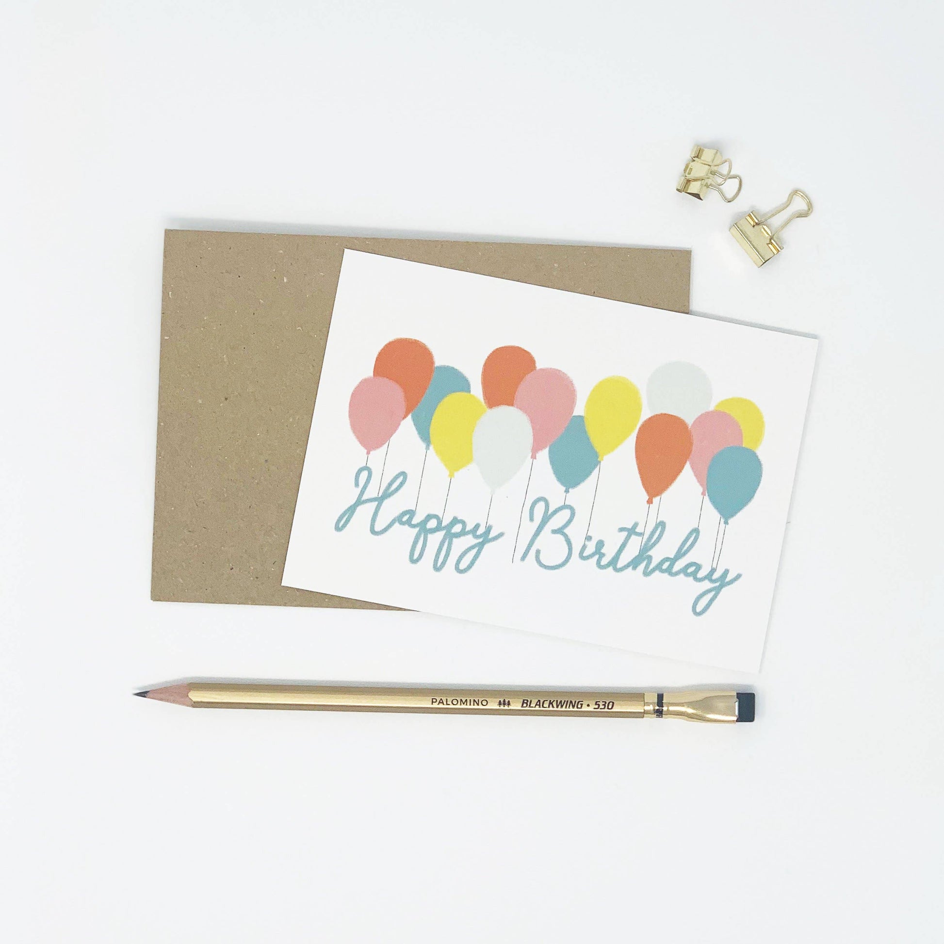 A colourful and simple illustrated "Happy Birthday" Balloon Card. This card is simple yet subtle and suits young and old. It's a handy card to have in stock for anyone's birthday. Featuring orange, pink, yellow, and aqua balloons.