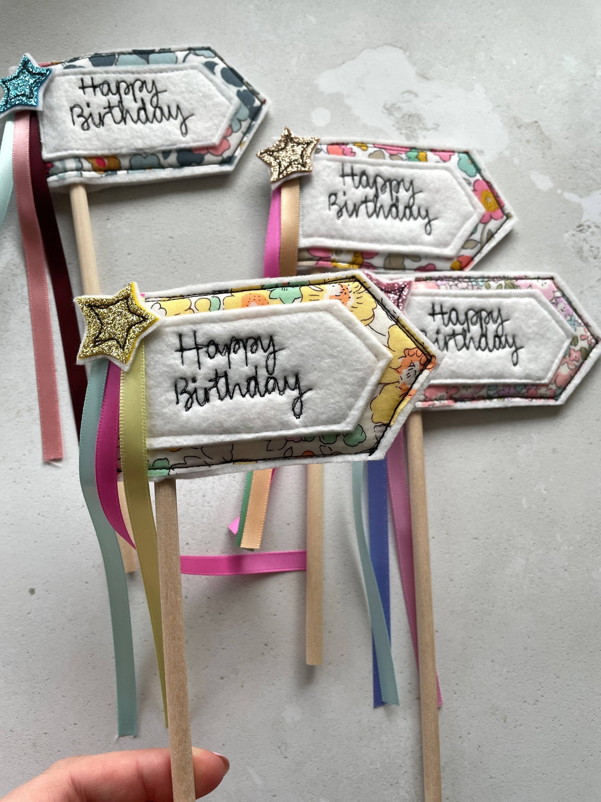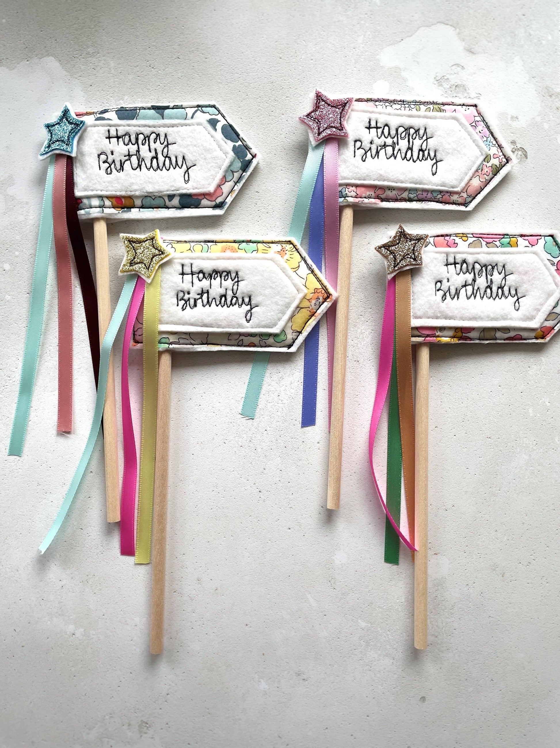 Celebrate your occasion in style with a freehand embroidered flag style cake topper decoration. The topper is made from fabric with a felt backing with co-ordinating ribbons and attached to a wooden dowling. It has been made to be used over and over. The flag is embroidered with the words 'Happy Birthday'. The topper measures 16cm wide x 20cm long including dowling. Other matching items are available in the birthday range. - Care Instructions - Reusable. Clean with a damp cloth immediately after use. These are for decorative purposes only and are not toys.