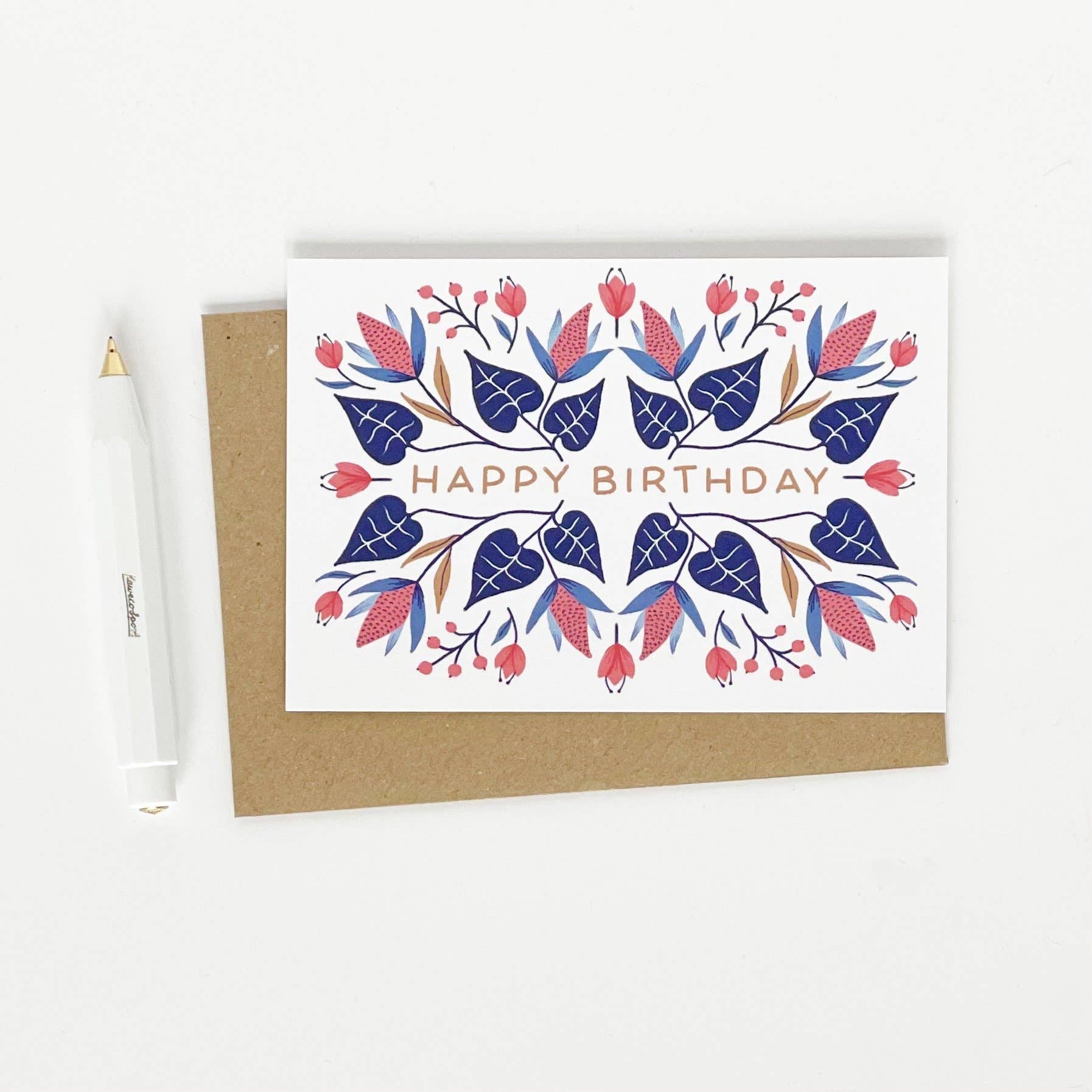 This botanical birthday card is inspired by a love of folk design. Printed on a textured rough paper and the designs look matt. No shine here at all making the design look more authentic and hand finished. The rough feel to this paper makes it very organic both to the touch and the eye. Card Details: - Single folded greeting card, 105 x 150mm (A6) - Blank inside for your own personal message - Printed on luxurious, thick (350gsm) - Includes Kraft 100% recycled envelope and a biodegradable plastic sleeve ALL MATERIALS ARE RECYCLABLE!