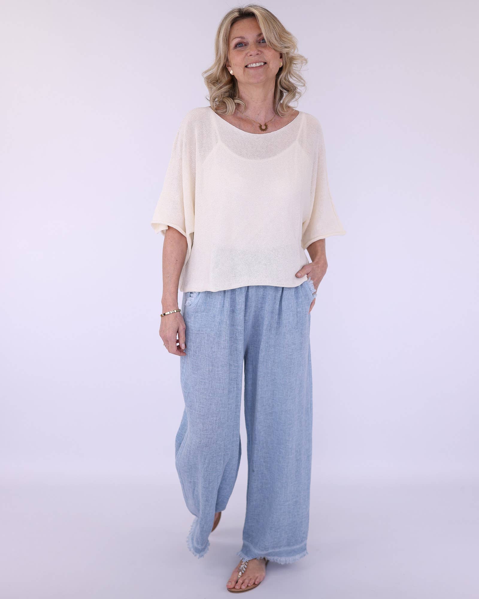 Made from a beautifully soft loose weave fabric which has a lovely drape, these casual trousers are a gorgeous alternative to Summer linen. Embellished with a frayed trim around the hems and on the side pockets, which perfectly complement the comfy, laid-back style and fit. The waistband is elasticated.