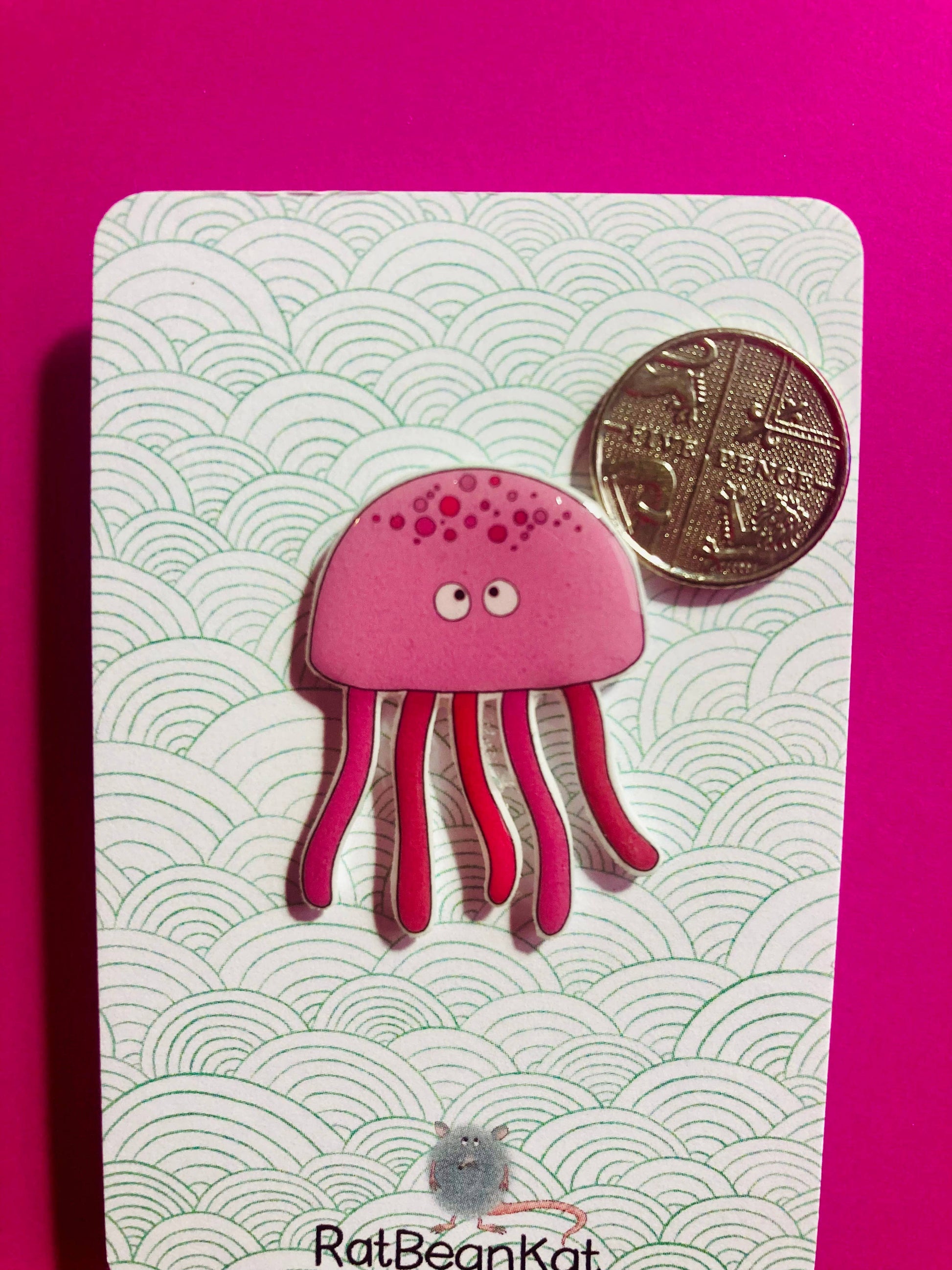 This little jellyfish pin badge has been made in Yorkshire. It has been drawn digitally, printed and hand finished. Each badge may also differ ever so slightly slightly from the one pictured.