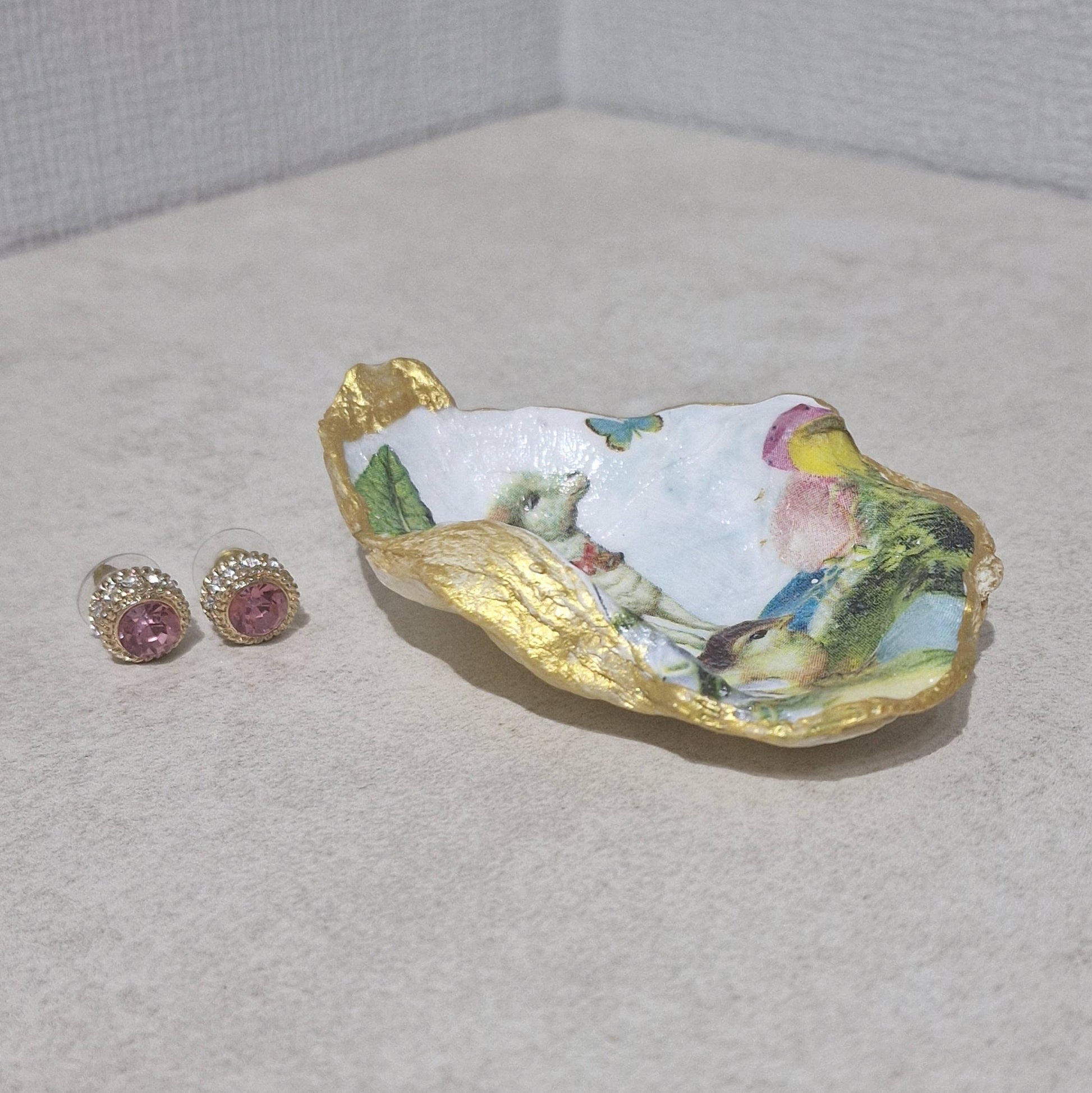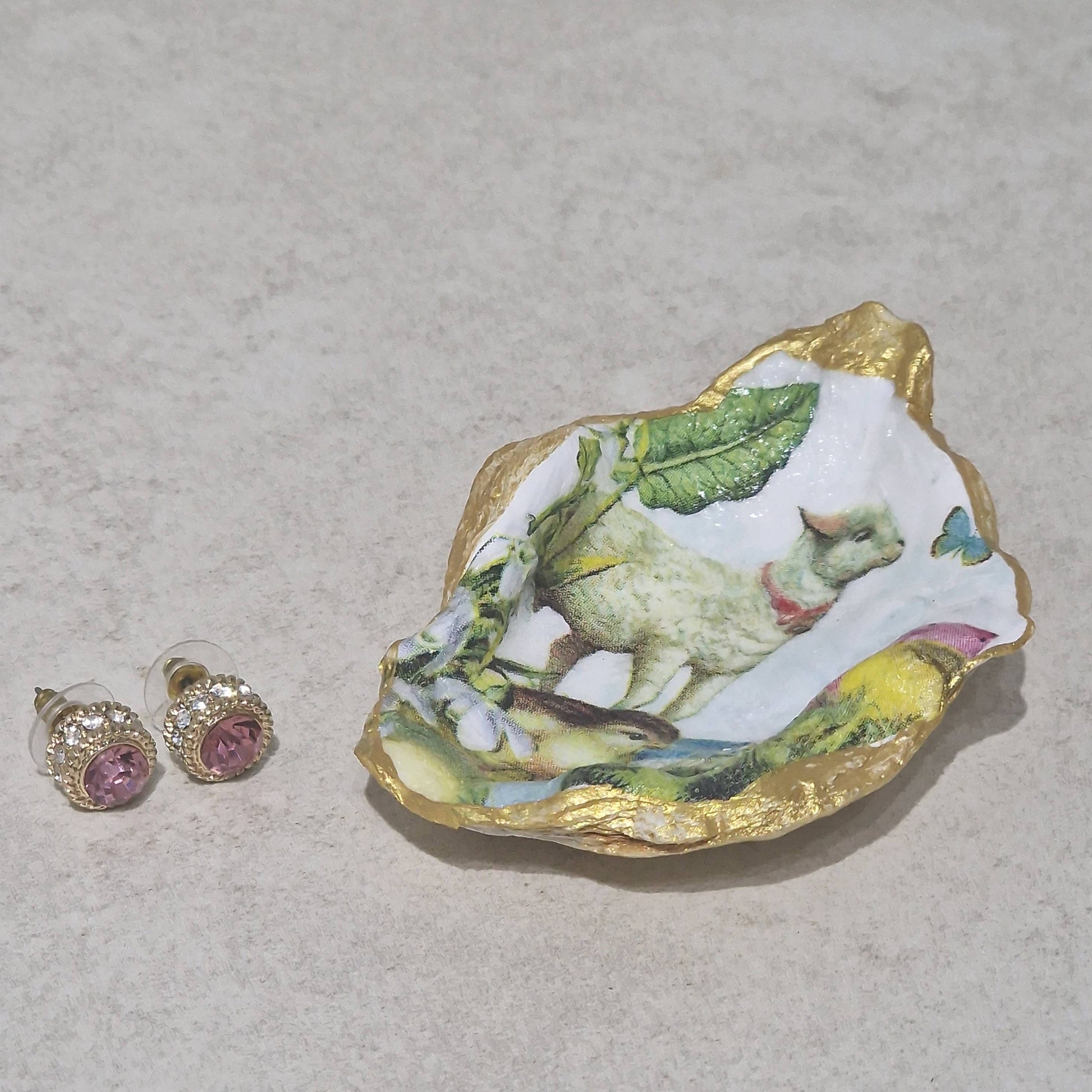 Easter Lamb Chick Eggs Oyster Shell Trinket Dish Gift. These decorative oyster shells are perfect for dressing tables to hold jewellery - they are pretty gifts and make lovely ornaments. They are handmade in the UK using a twelve step process - a decoupage technique and hand painting the gold edges. Each shell is totally unique. Shells can be wiped clean with a damp cloth.