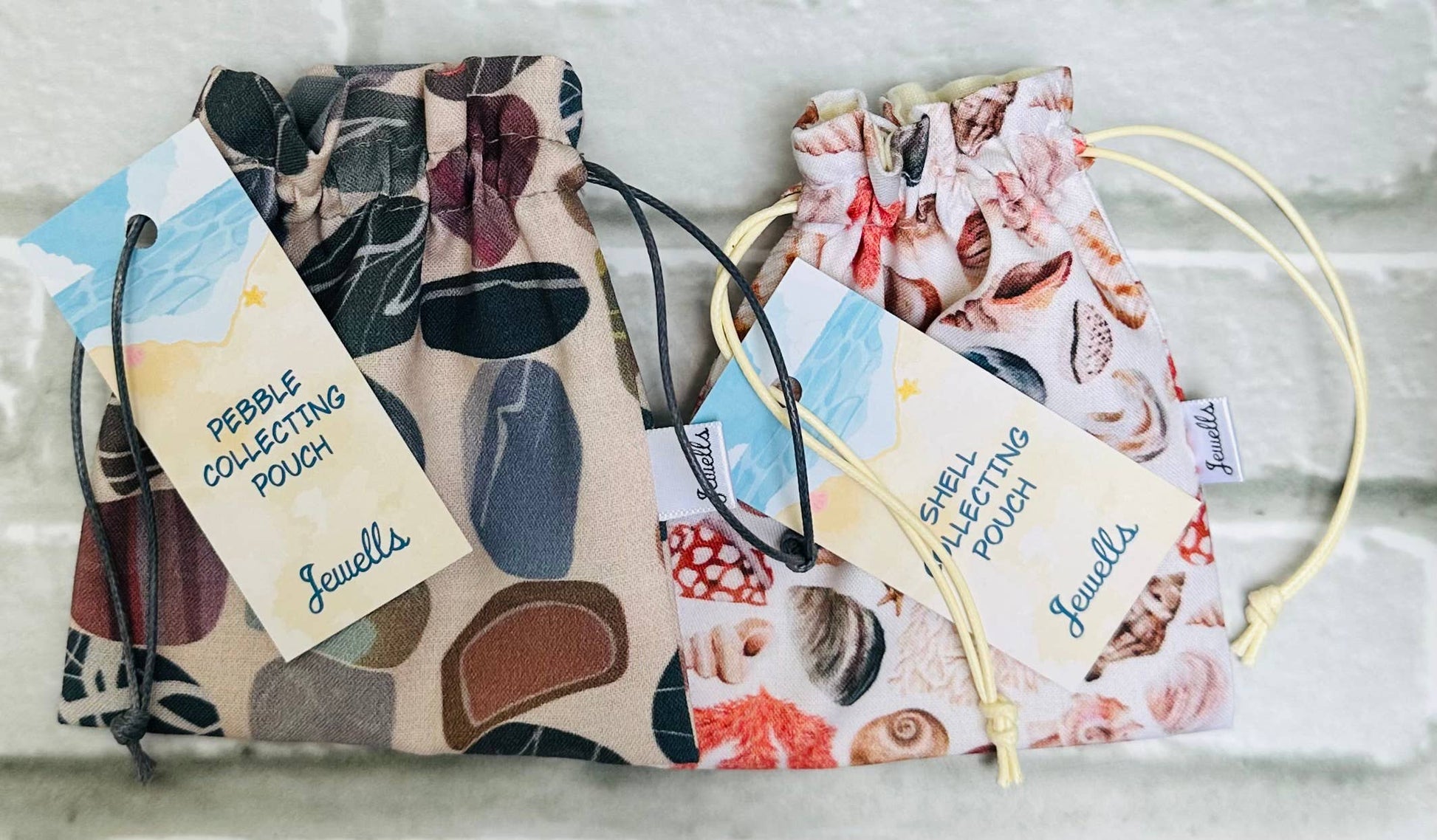 Pebble fabric beach collecting pouch Measures approximately 12cm across. Plain dark grey lining with grey pull cord. Swing tag. Handmade by Jewells