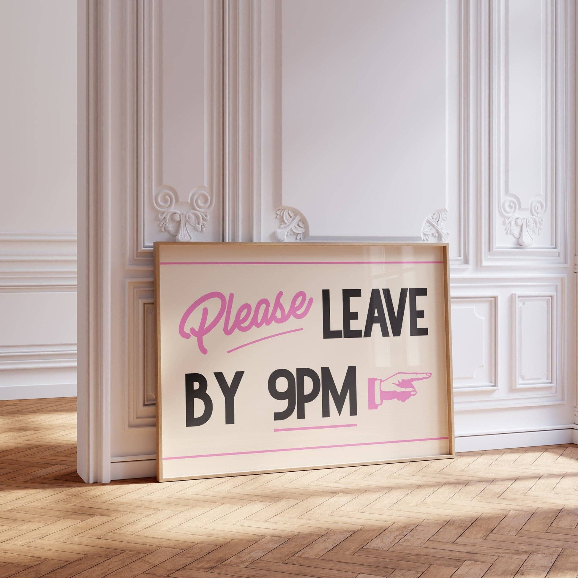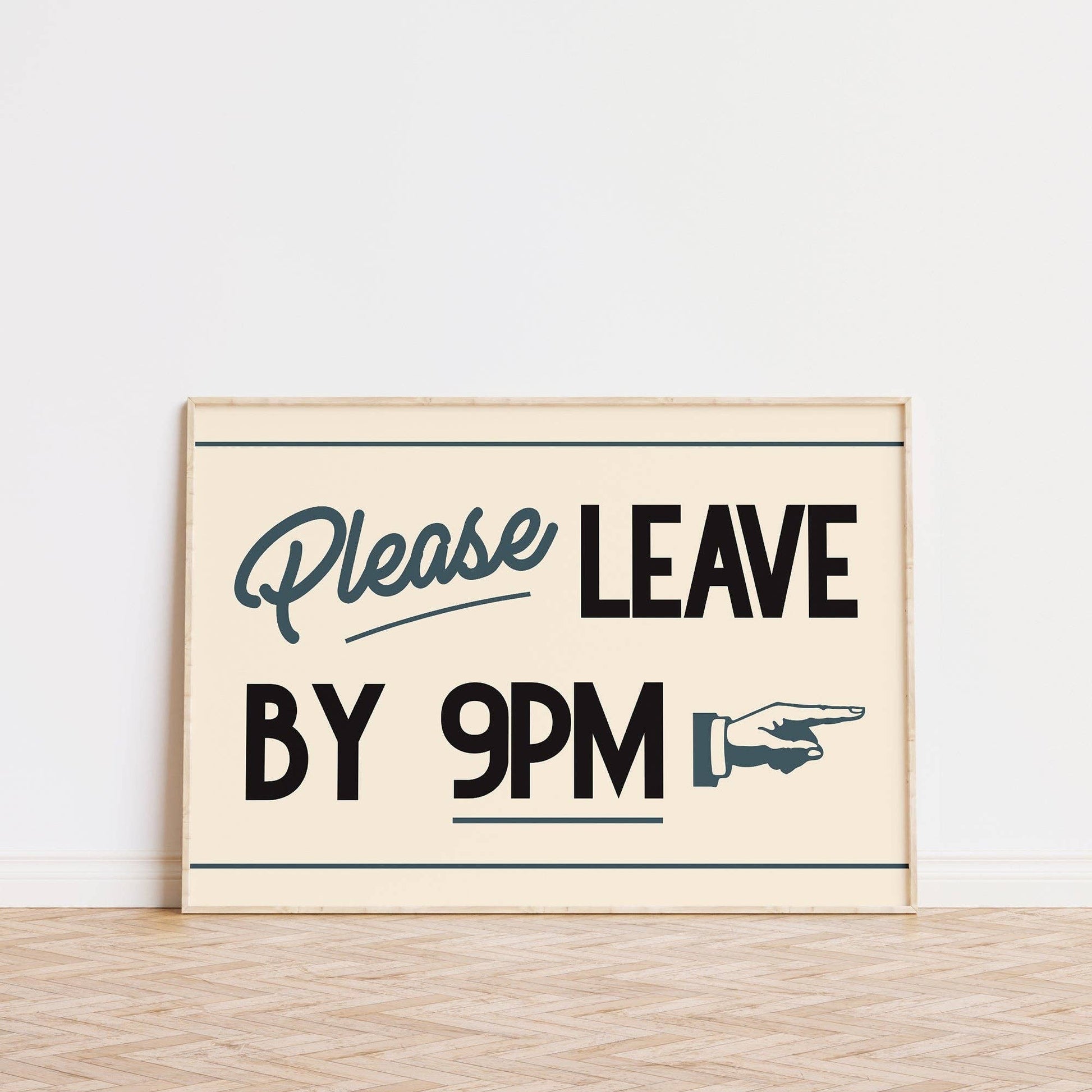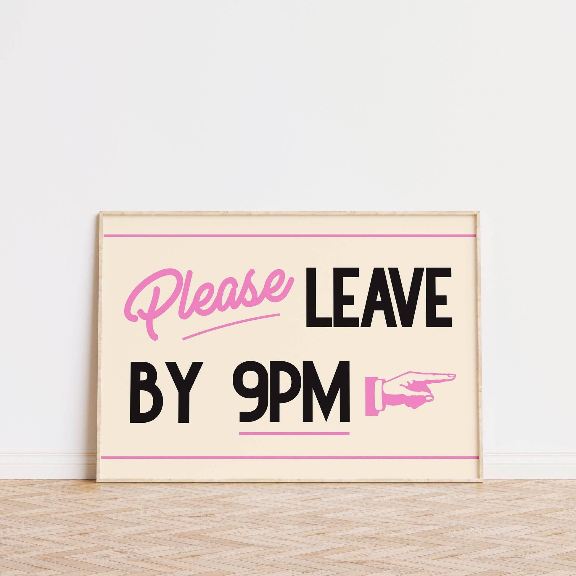 Please Leave By 9pm Print. Printed on high quality 230gsm matte paper. All prints are packaged individually with a backing board in a protective sleeve with a small ‘Lune Club’ sticker. A5 - (14.8 x 21 cm / 5.8 × 8.3 inches) Please note prints come unframed.