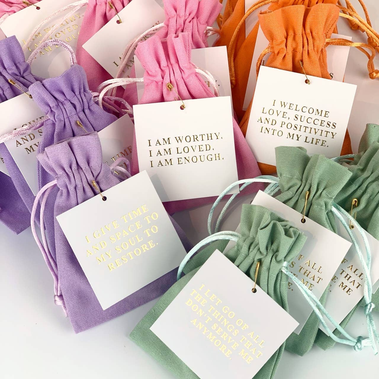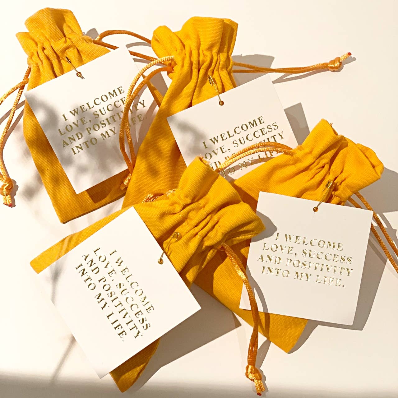 Positive Crystal Kit comes with a crystal guide and an Orange Organic Cotton drawstring linen pouch.