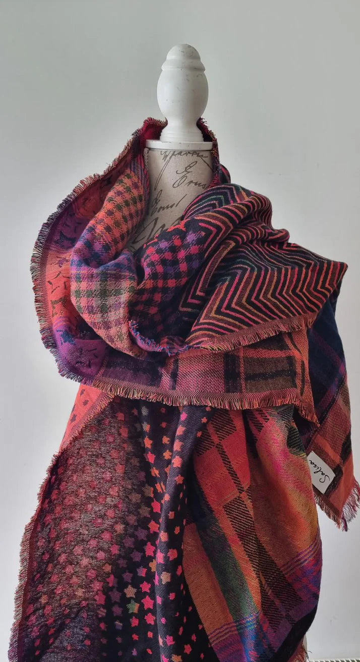 A two tone weave scarf with a black background with star, chevron and square mixed pattern design. One side is muted tones and the other is the reverse with brighter tones.