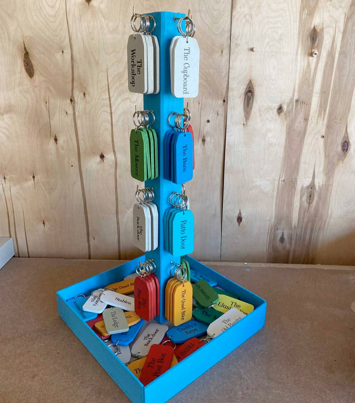 Handmade wooden keyrings. Chunky, hand-painted keyrings painted in Farrow & Ball paints. Sustainable wood. Made in Suffolk. Colours and dimensions may vary.