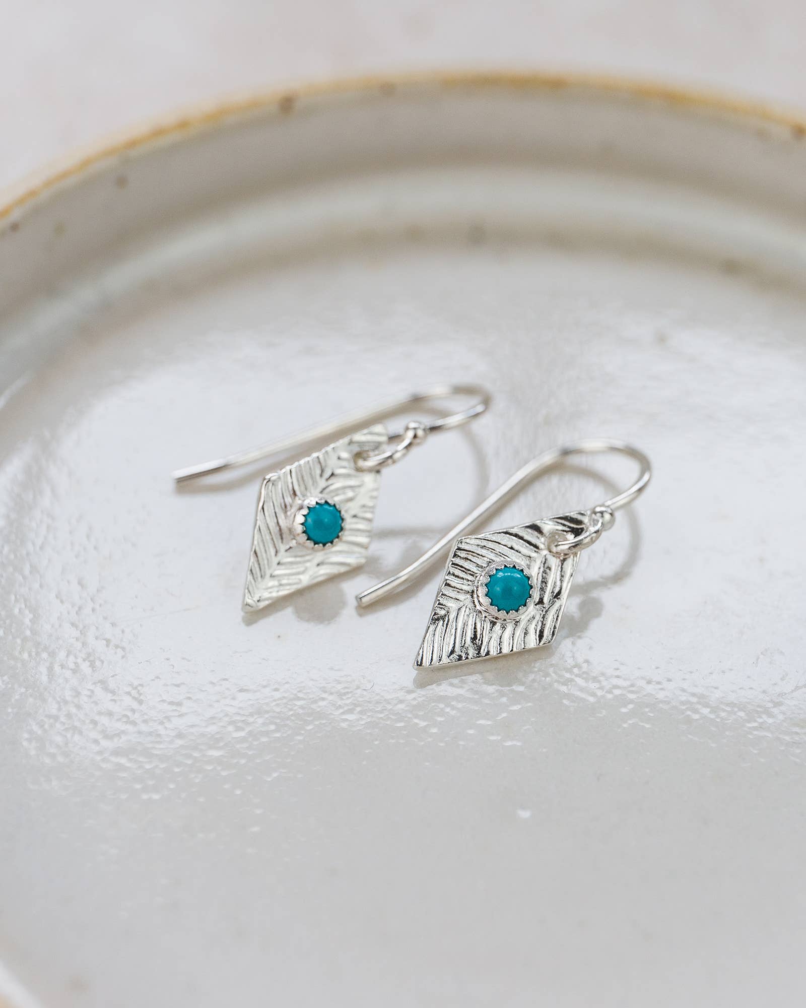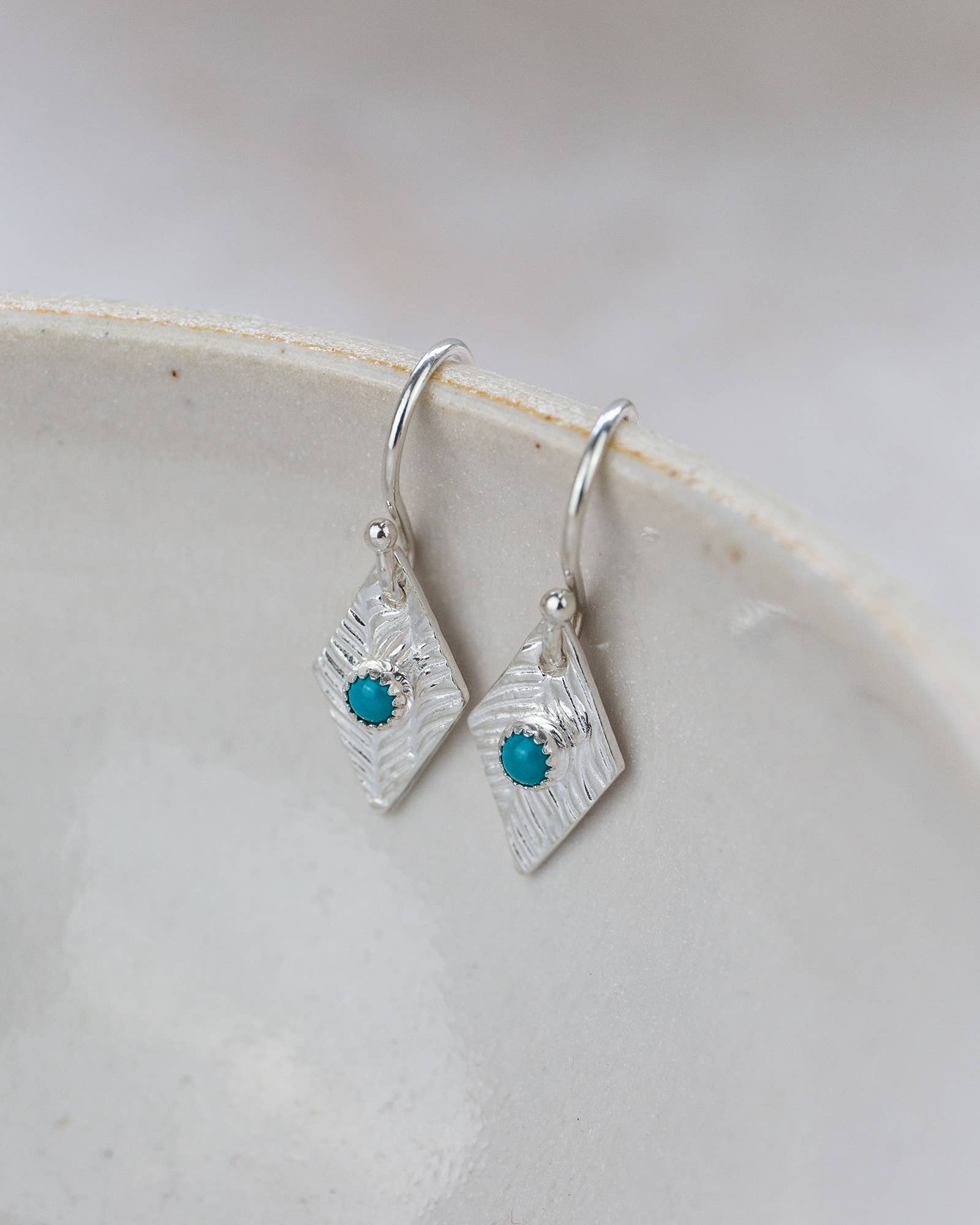 Handmade Sterling Silver Diamond and Turquoise Earrings. Charm approx. 19mm with 3mm stone complete with sterling silver ear wires. Displayed on a Lucy Kemp Jewellery Earring Card. All jewellery is handmade using recycled sterling silver where possible.