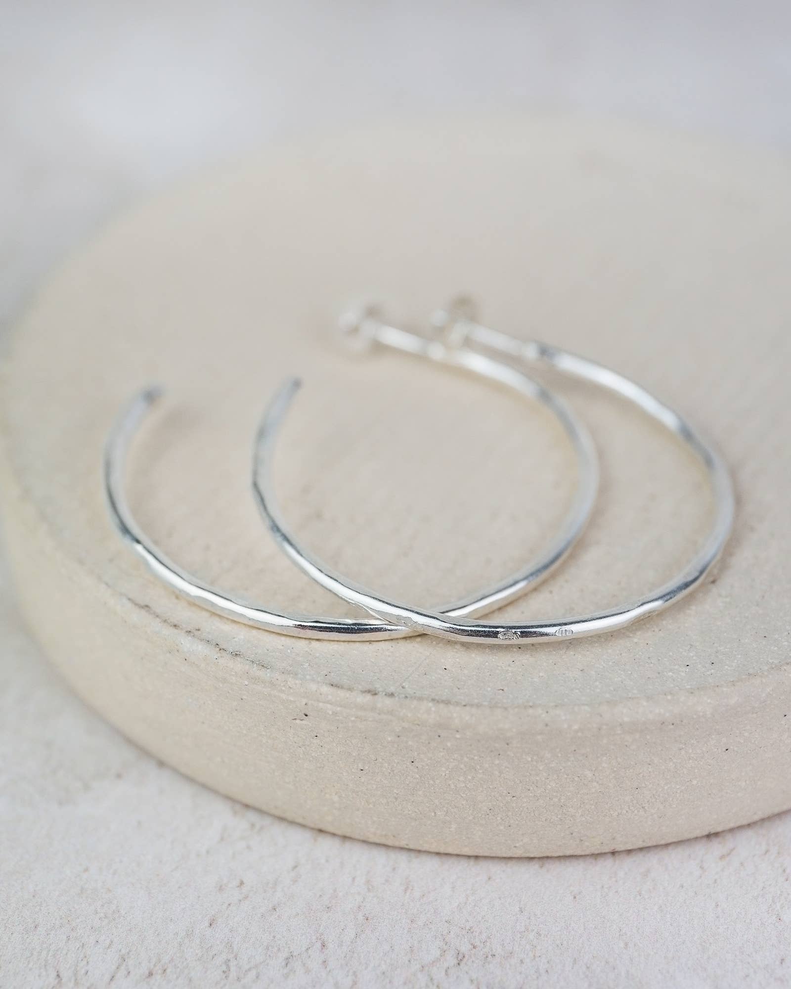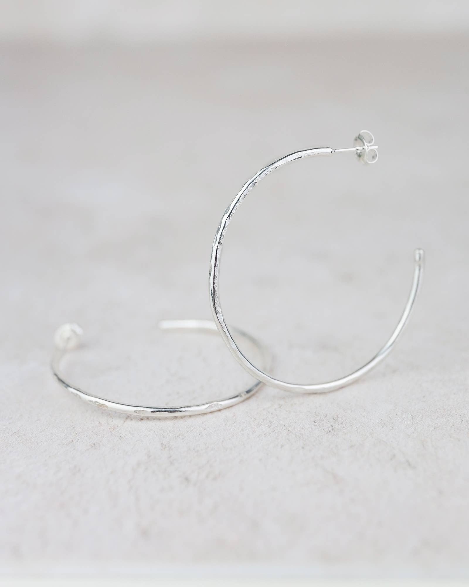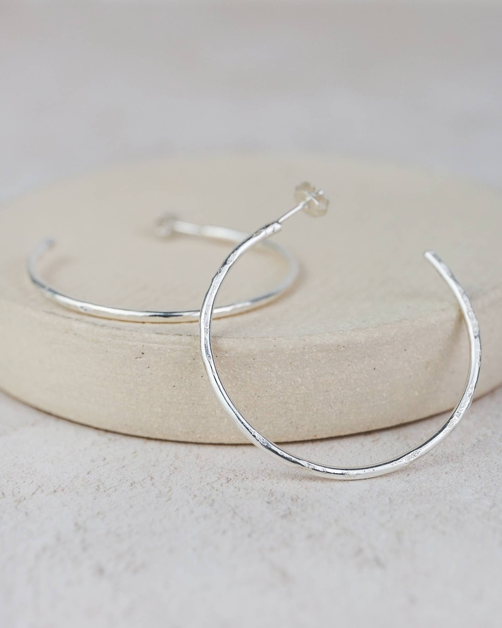 Handmade sterling silver every day hoop with delicate hammered texture. The sterling silver hoops are approximately 35mm in diameter These hoops have a stud style fastening for extra comfort meaning they are perfect for everyday use. All jewellery is handmade using recycled sterling silver.