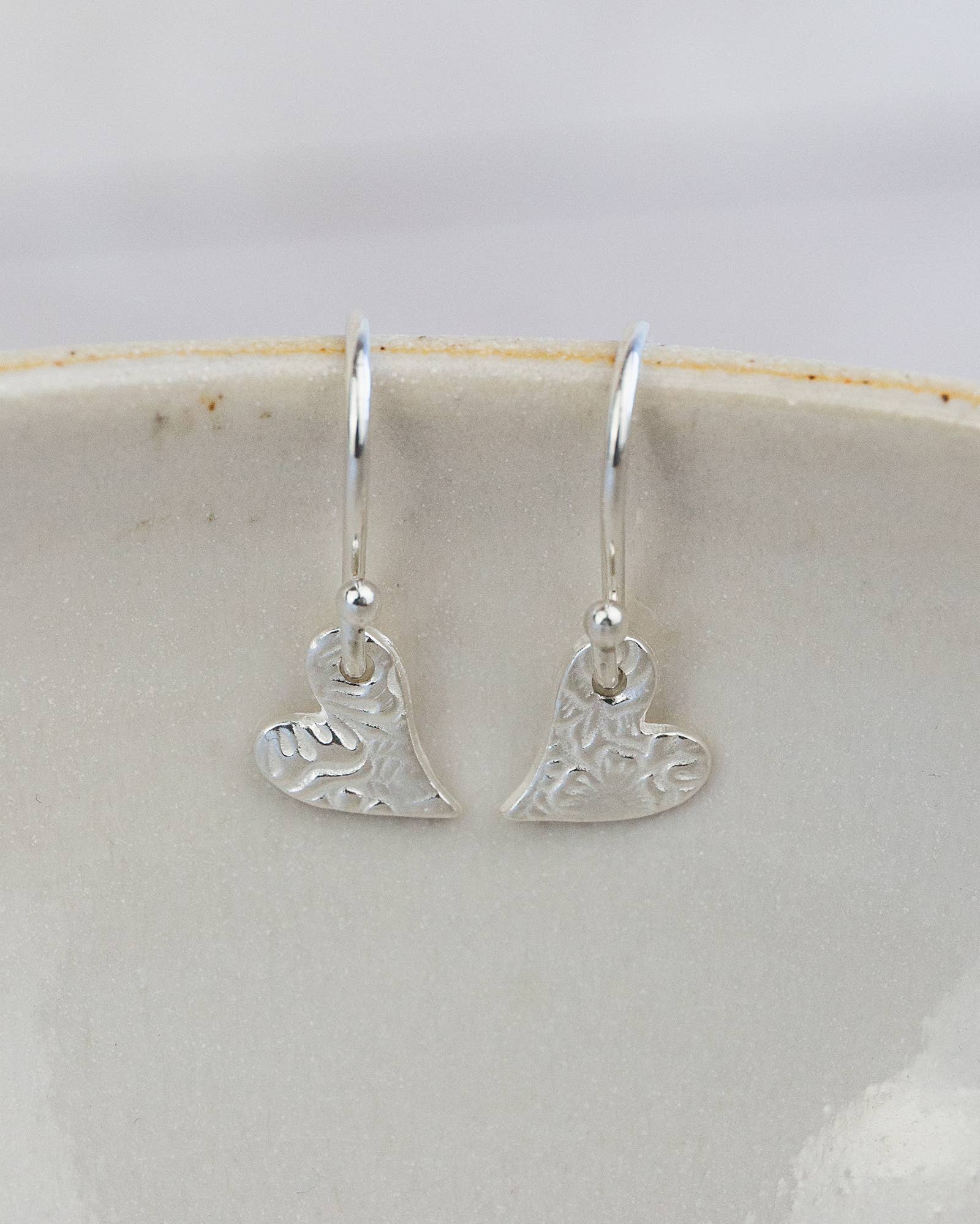Handmade sterling silver textured earrings, complete with sterling silver ear wires. Choose from; Hearts and tilted hearts. Displayed on a Lucy Kemp Jewellery Earring Card. Handmade using recycled sterling silver where possible.