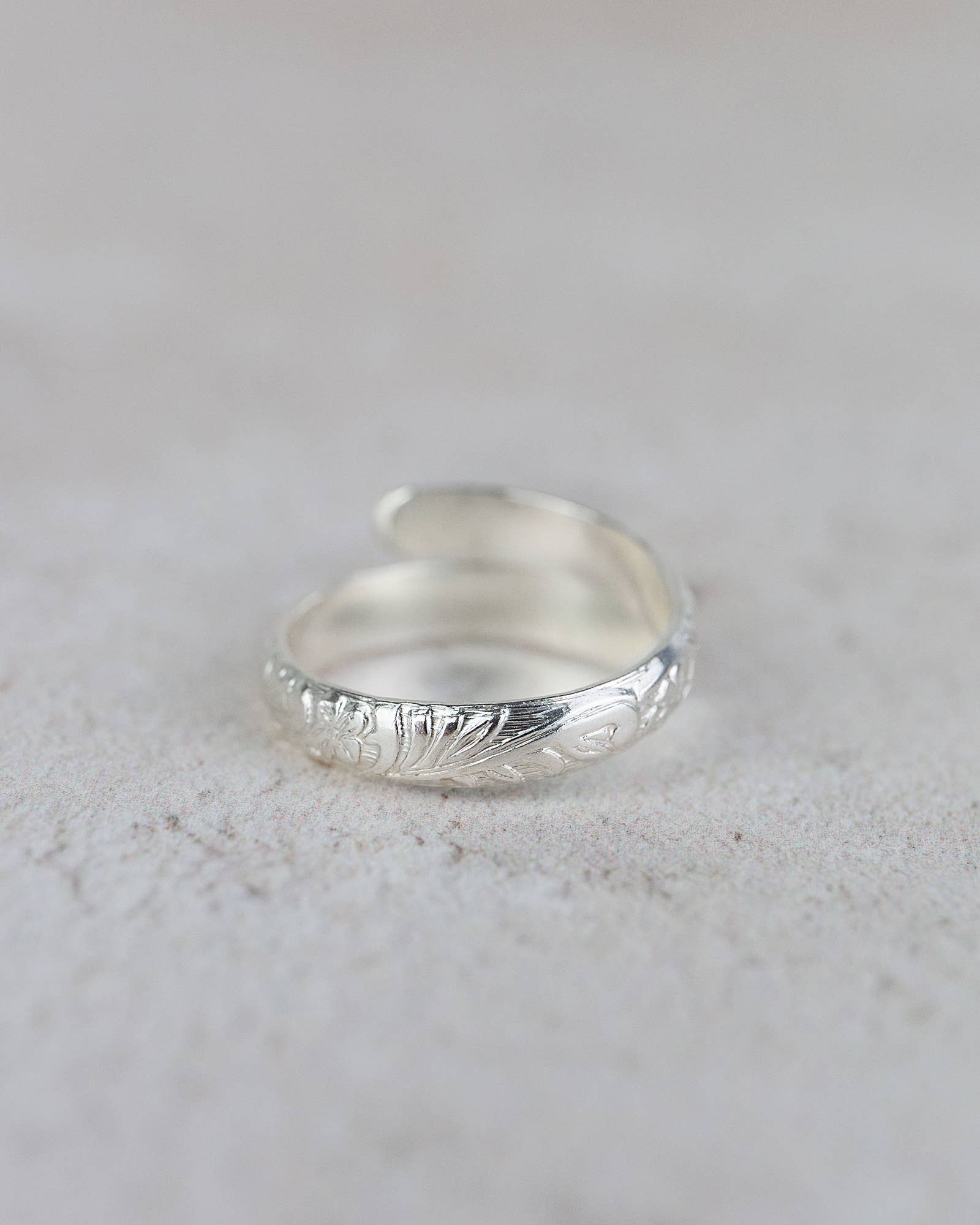 This exquisite handmade sterling silver wrap-around thumb ring is adorned with a delicate floral texture on its front. Constructed from environmentally-responsible recycled sterling silver, it is 60mm in length and 20mm wide, but is adjustable for a comfortable fit. Designed to be adjustable and one size fits all. Approx 60mm in length 20mm wide All jewellery is handmade using recycled sterling silver where possible.