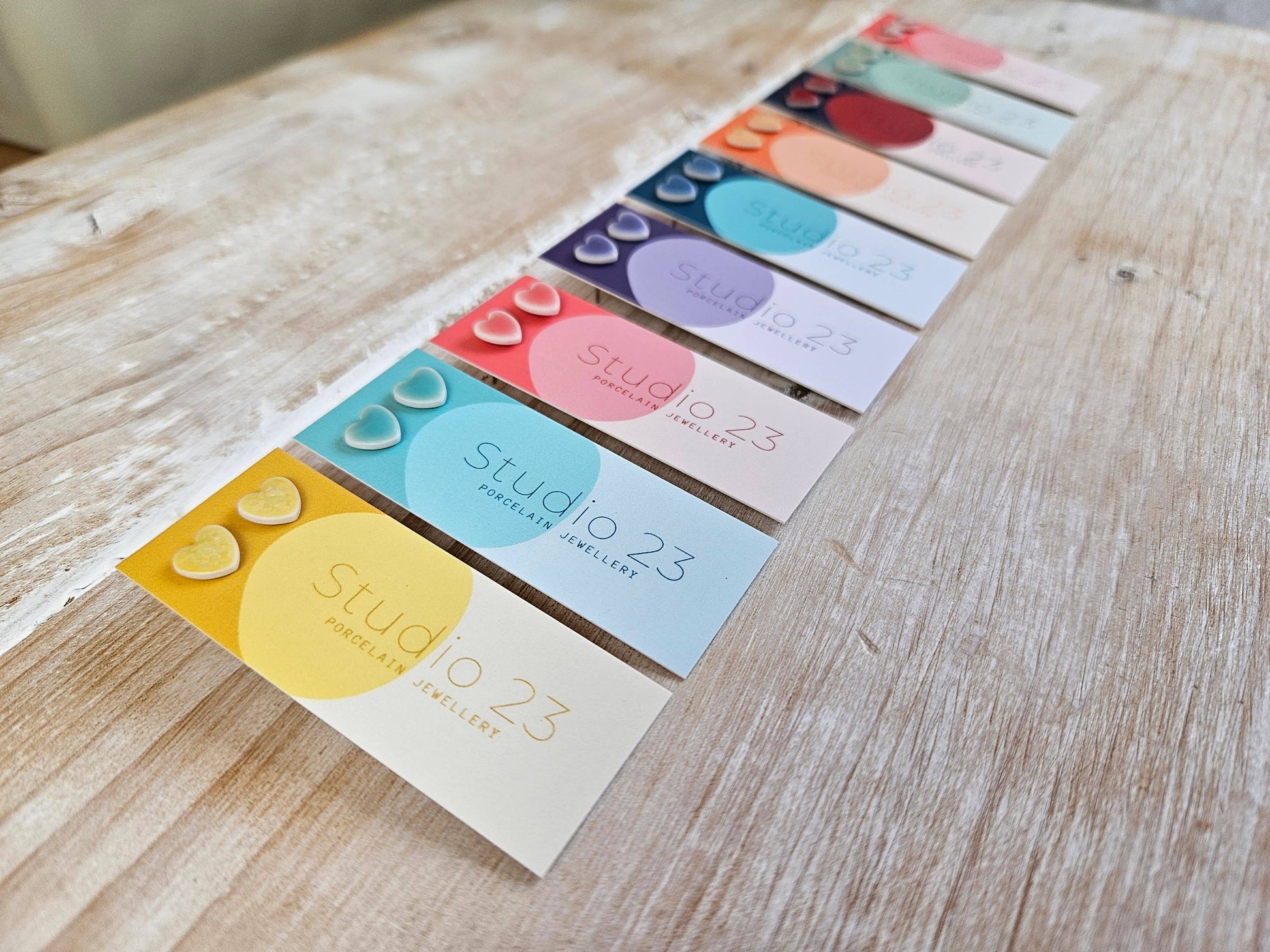 Pair of heart-shaped porcelain clay stud earrings glazed in a range of decorative pastel stoneware glazes. The studs are approximately 8mm in diameter and have stainless steel hypoallergenic backs and come presented on a small coloured matte card ready to display. Handmade by Gaby in her Manchester studio.