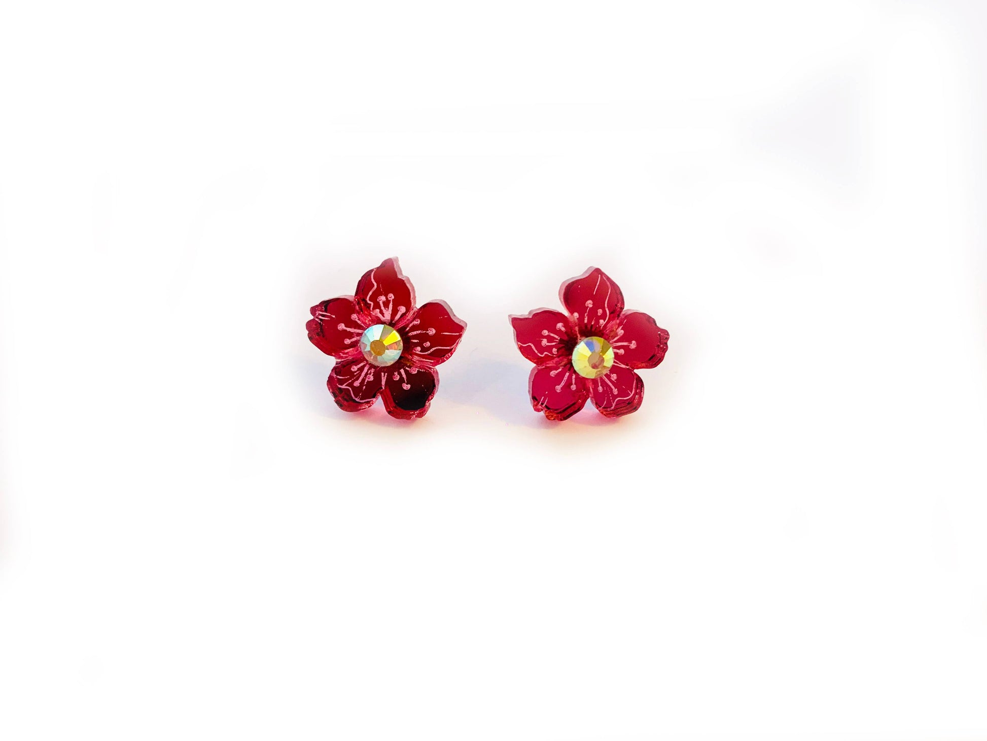 'Pretty acrylic flower studs with gems' what a lovely pair of beautiful pretty acrylic flower studs for summer! Dainty and dazzling! Earring Basics * Acrylic flowers with gem * Measurement 2cm x 2cm * Bright pink! great gift idea * Hypoallergenic * Butterfly push backs