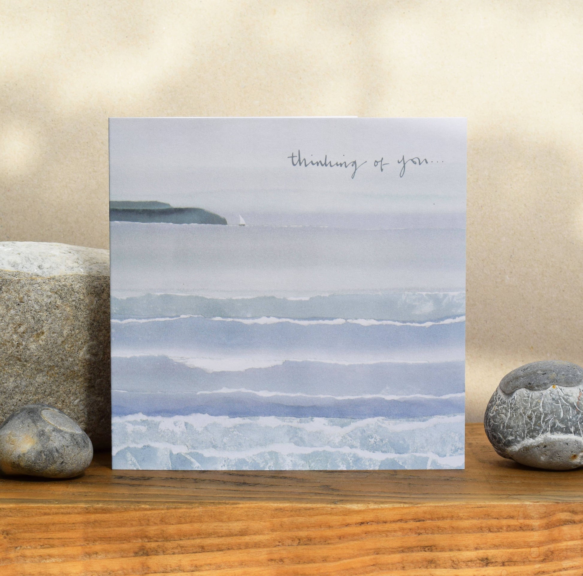 Sympathy card with a peaceful image of the sea showing a distant sailing boat. Designed and beautifully printed in the UK on gorgeous, sustainably sourced board. 15cm x 15cm with 100% recycled kraft envelopes, supplied unwrapped with an easy-peel removable label holding card and envelope together. Blank inside for your own message. Windsock Press