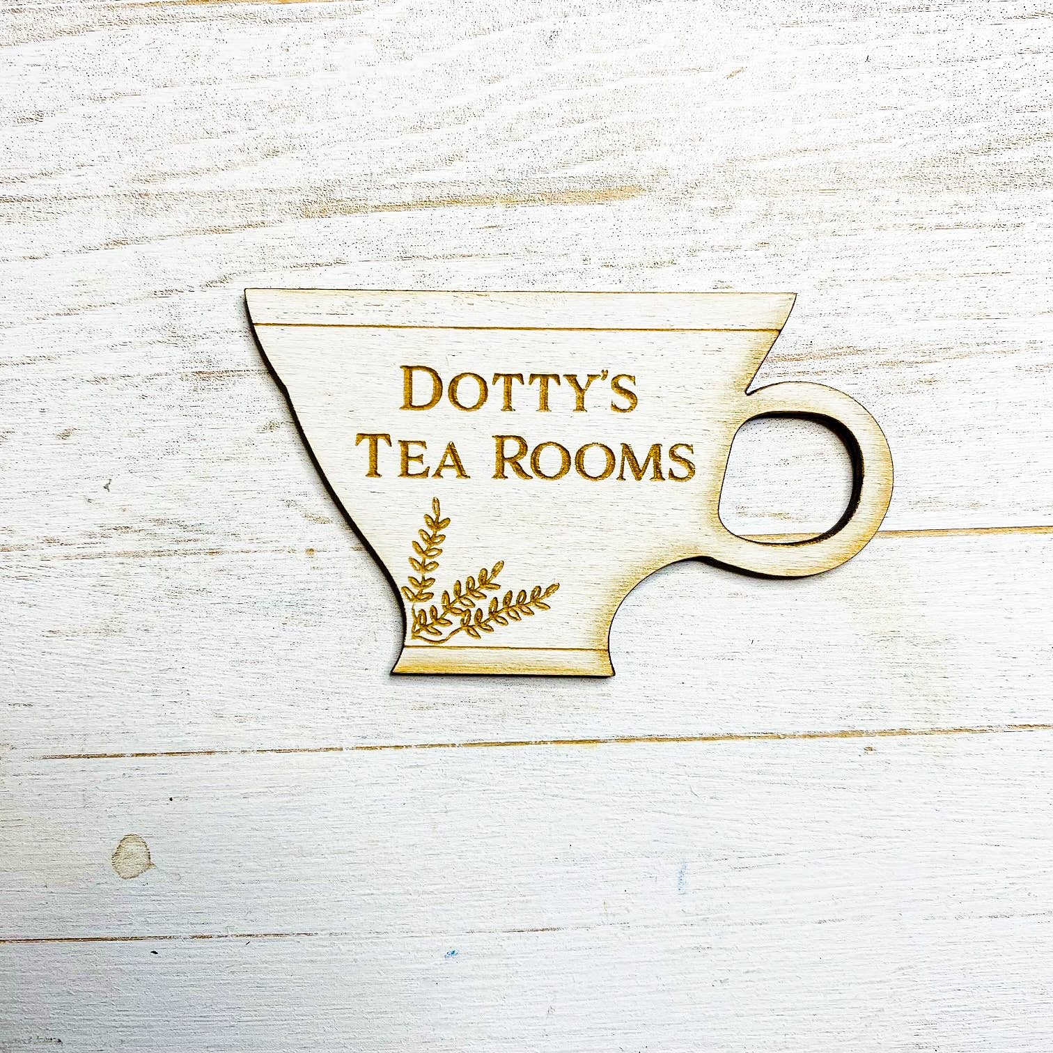 Engraved on to painted wood, a lovely keepsake teacup magnet with Ann's Pantry engraved onto wood. -7.5 x 4.5 x 0.4cm -Engraved on to whitewashed plywood