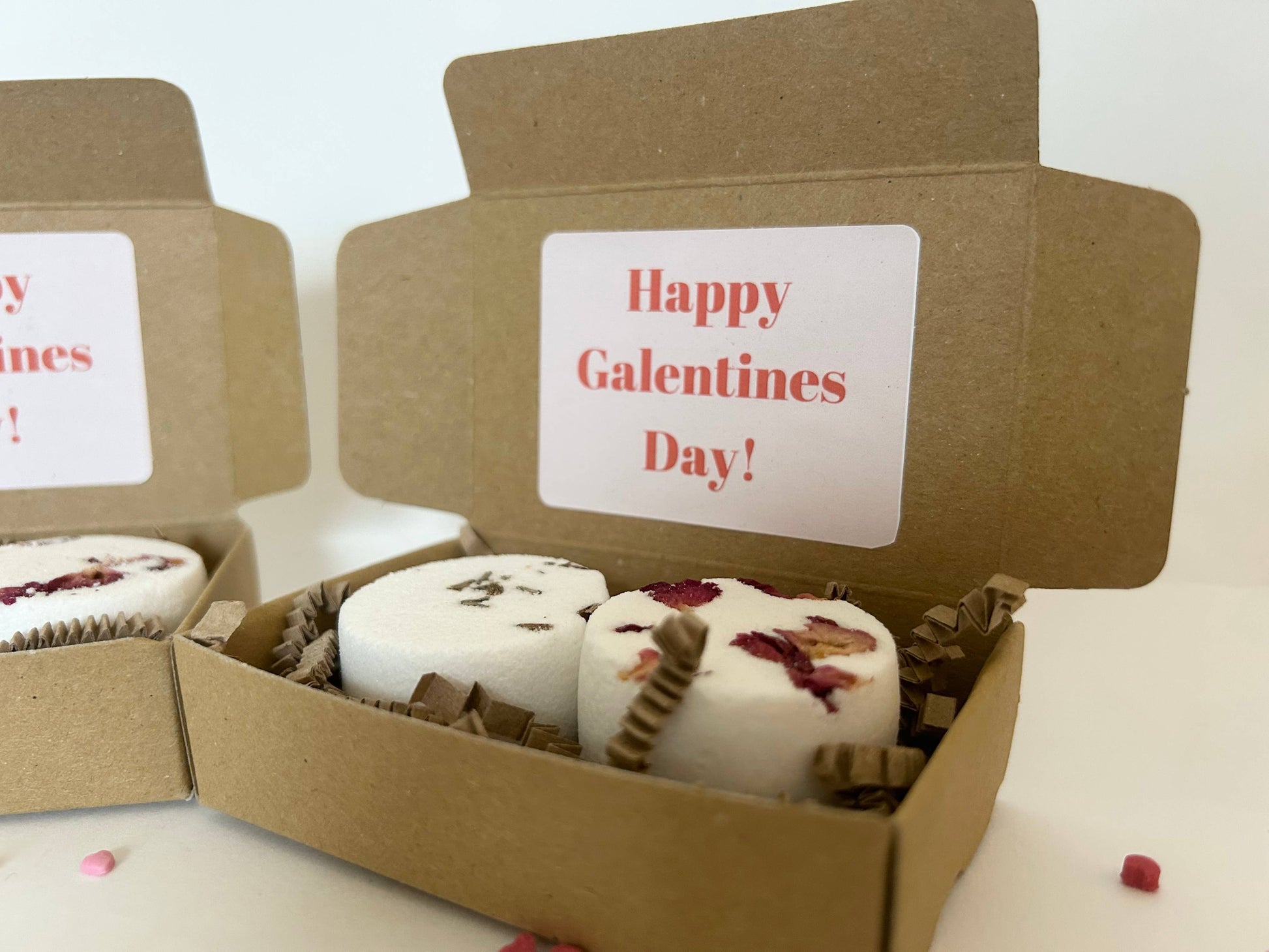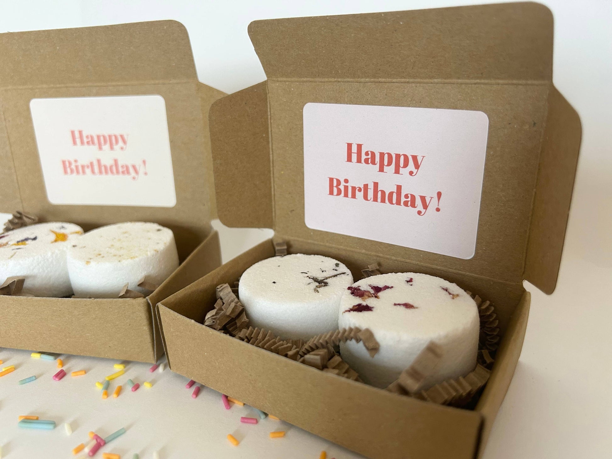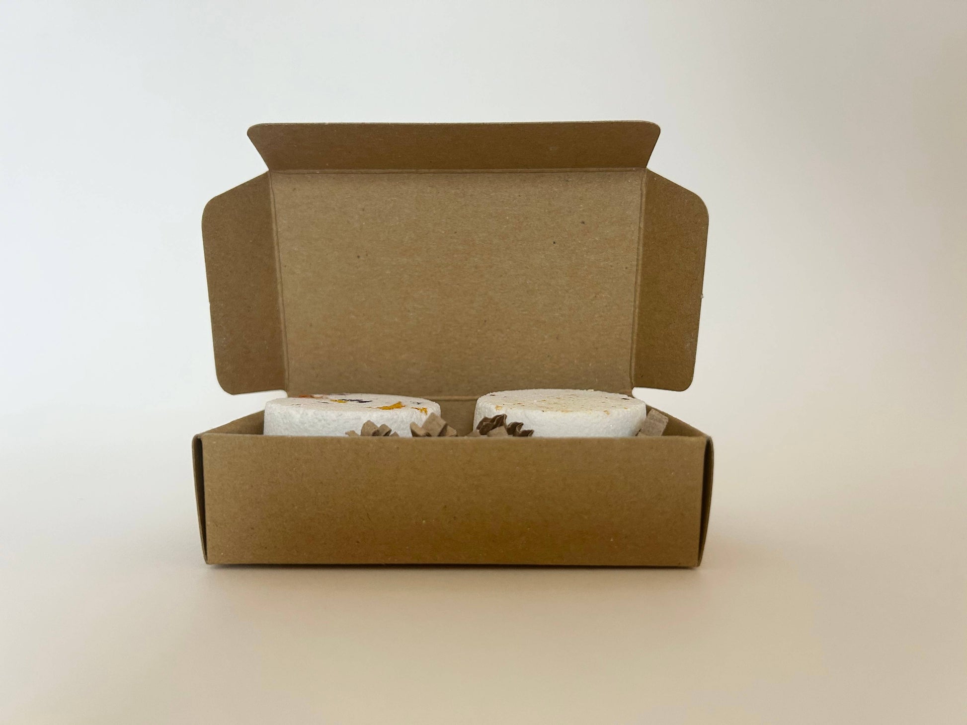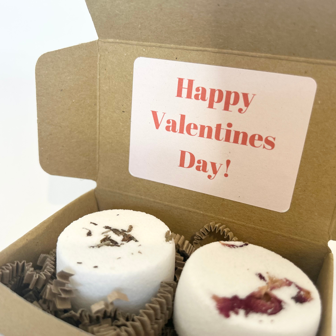 This two piece mini shower steamers gift set includes two mini shower steamers in the following Relaxing blends: 1x Lavender, Chamomile & Peppermint blend and 1x Rose Geranium blend. A beautiful and unique gift, this set of two luxurious shower steamers is the ideal present if you’re looking for something a little different. Size of box: 90mm x 60mm x 25mm Size & weight of individual shower steamers: 26g/ 39mm x 20mm Packaging: A kraft paper box with a recycled paper belly band sealed with a plastic free seal. All products are labelled to UK labelling requirements. Store and display in a cool and dry sp