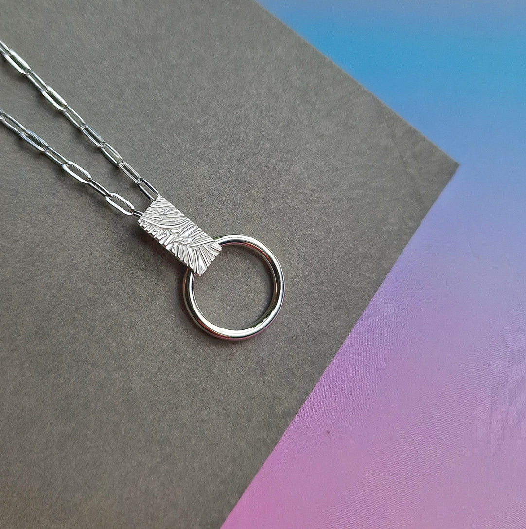 This beautiful Contrasting Chunky Necklace offers a unique and stylish look. Crafted with fine silver and featuring contrasting shapes and textures, this necklace complements any outfit. The free moving ring adds movement and an extra touch of style.