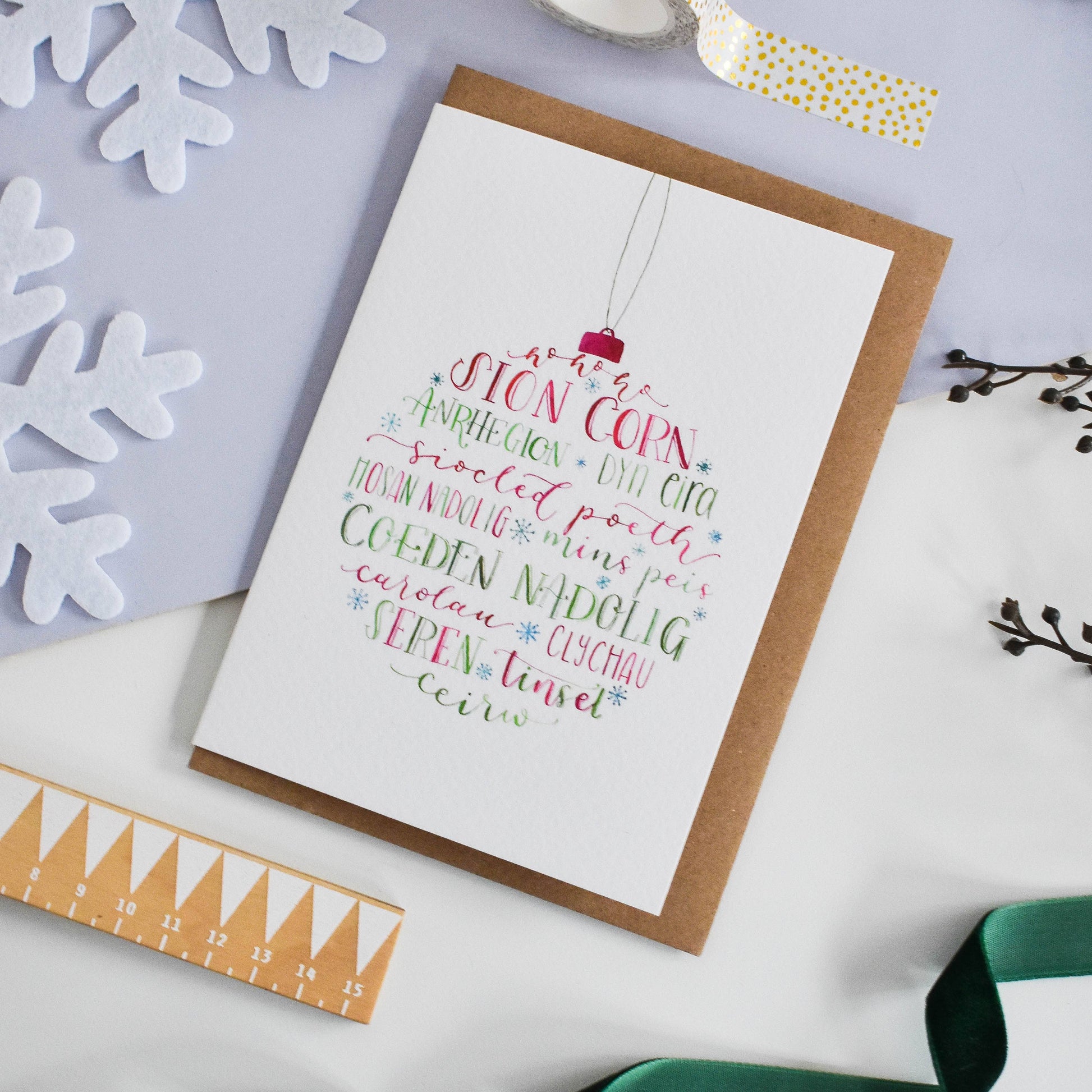 This pretty, festive design was originally hand painted using vibrant watercolour inks. It features a Christmas tree bauble, made up of Welsh language, hand-lettered festive words including "Sion Corn (Father Christmas), Carolau (Carols), Clychau (Bells), Dyn Eira (Snowman)" etc. The illustration has then been reproduced onto high quality, luxurious card. It feels like a subtle watercolour paper and is a joy to write on! DETAILS: - Size: A6 (105 x 148mm) - Printed on thick (300gsm), subtly textured, FSC certified paper. - Blank inside - Includes a recycled, brown envelope - A single card will be packaged in a compostable, recyclable and biodegradable sleeve.