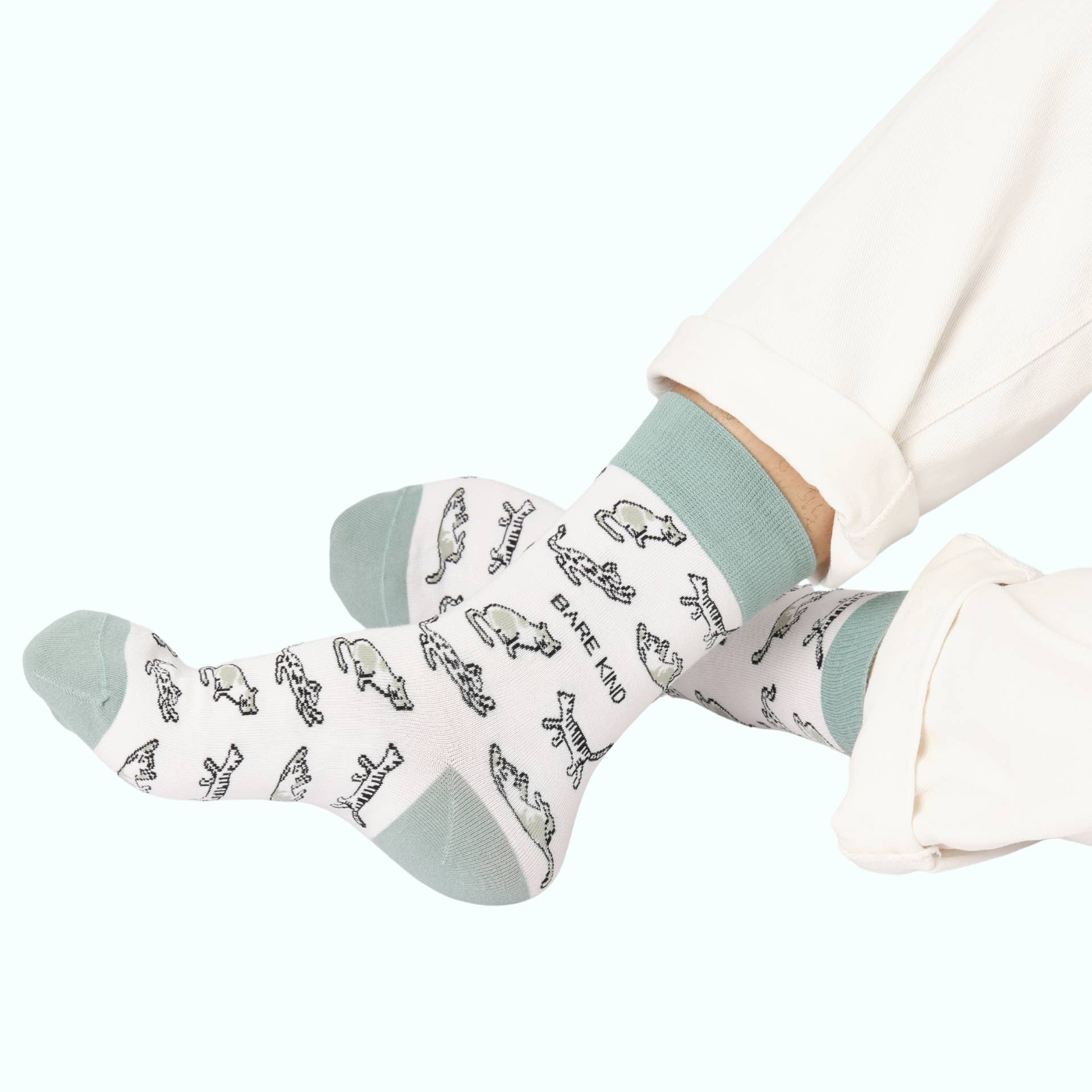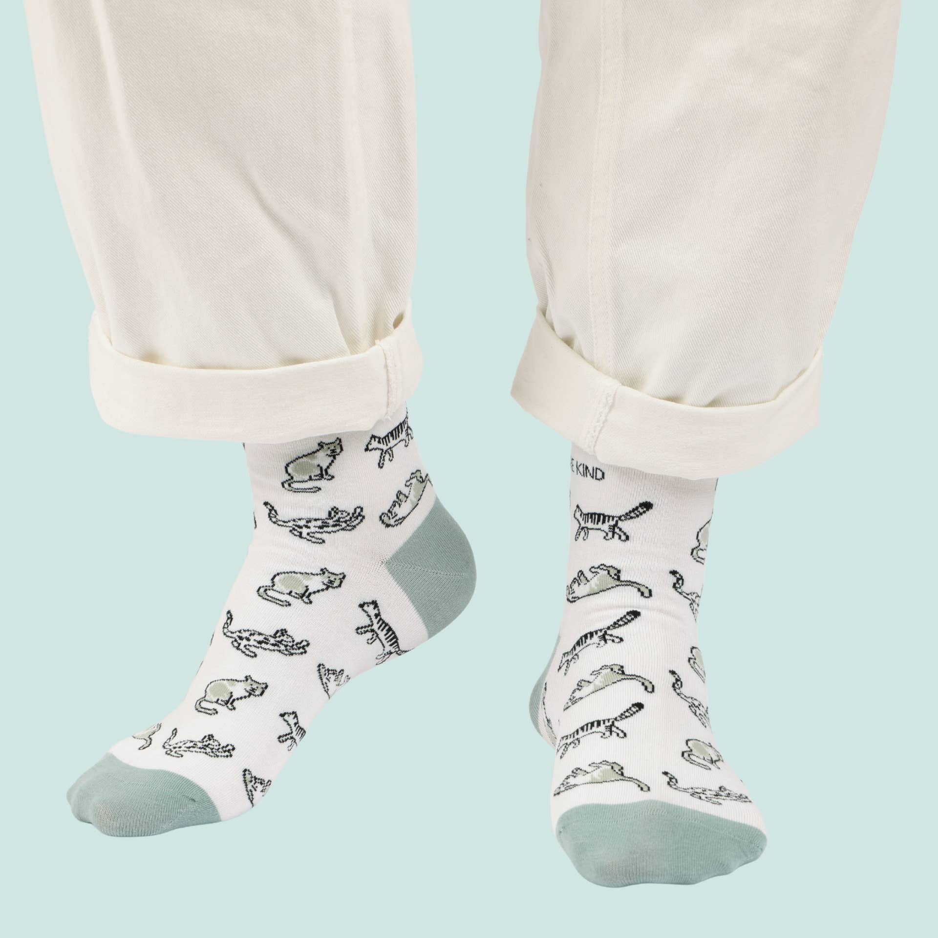 These Socks Save Cats. We will donate 10% of profits to a charity that helps protect cats and find them forever homes. These socks are: * Thermoregulating (cool in summer, warm in winter) * Sweat-proof (moisture-wicking & anti-bacterial) * Softer than cotton * Wash cold for the environment (30 degrees) * OEKO-Tex Certified * SEDEX Audited * 100% Recyclable packaging Bare Kind was founded by Lucy in 2018 to save endangered animals worldwide through partnerships with Charities. These gender neutral socks are loved by all.